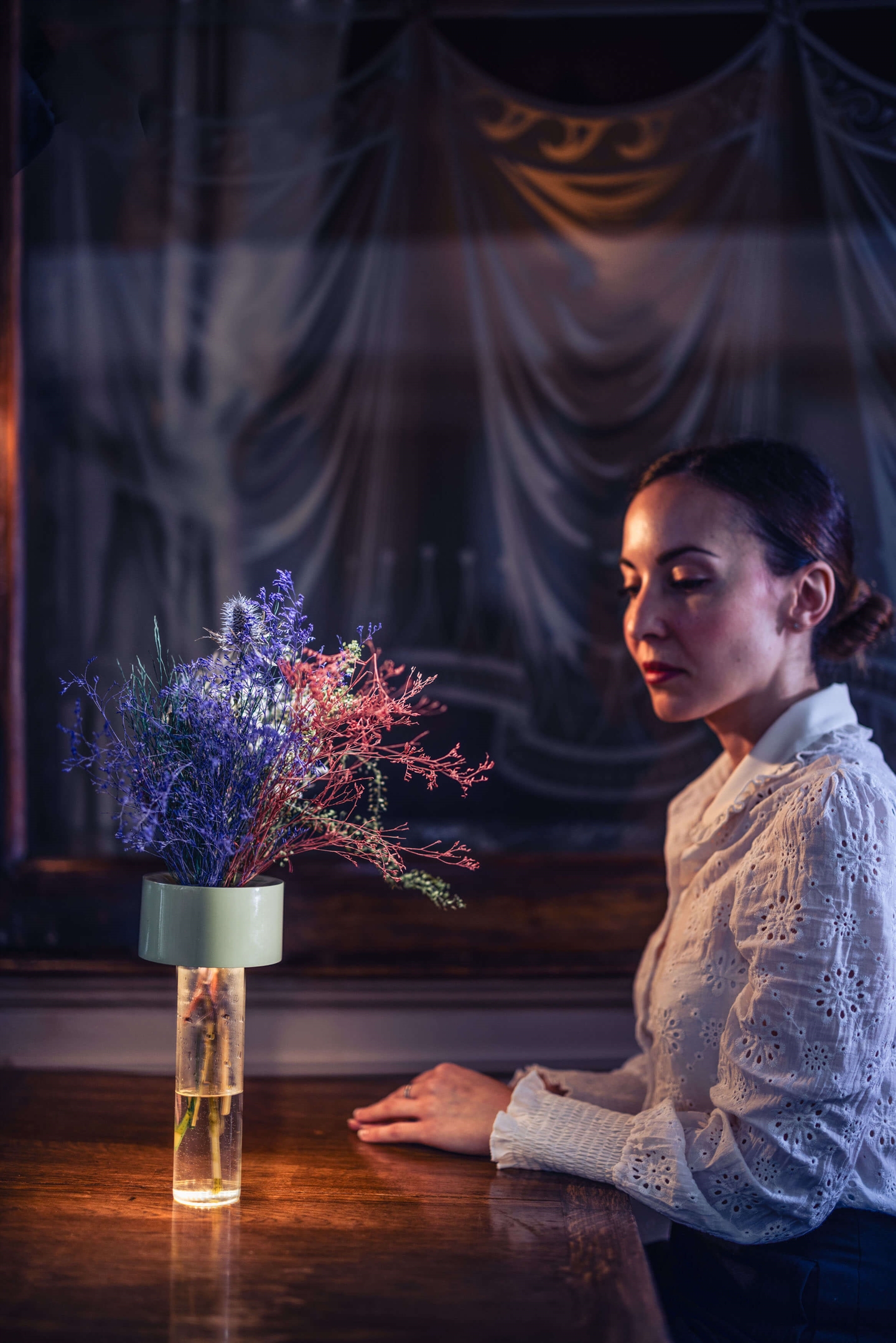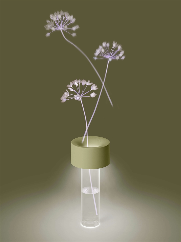 Akkuleuchte Fleur ist eine wiederaufladbare Tischleuchte, die ein nach unten gerichtetes Licht hat und neben der Stimmungsbeleuchtung auch als Vase verwendet werden kann, die mit Wasser gefüllt werden kann. Die Lampe besteht aus einem zylindrischen Sockel aus Glas und einem einfarbigen Oberteil mit der LED-Lichtquelle und ist in drei Stufen dimmbar. Sie kann 7 Stunden bei 100 Prozent, 9 Stunden bei 70 Prozent und 13 Stunden bei 30 Prozent leuchten.