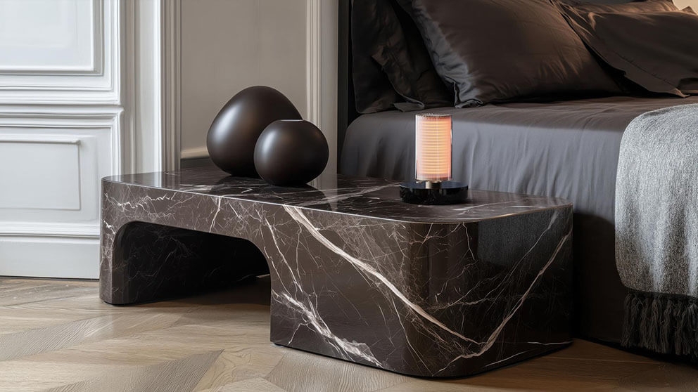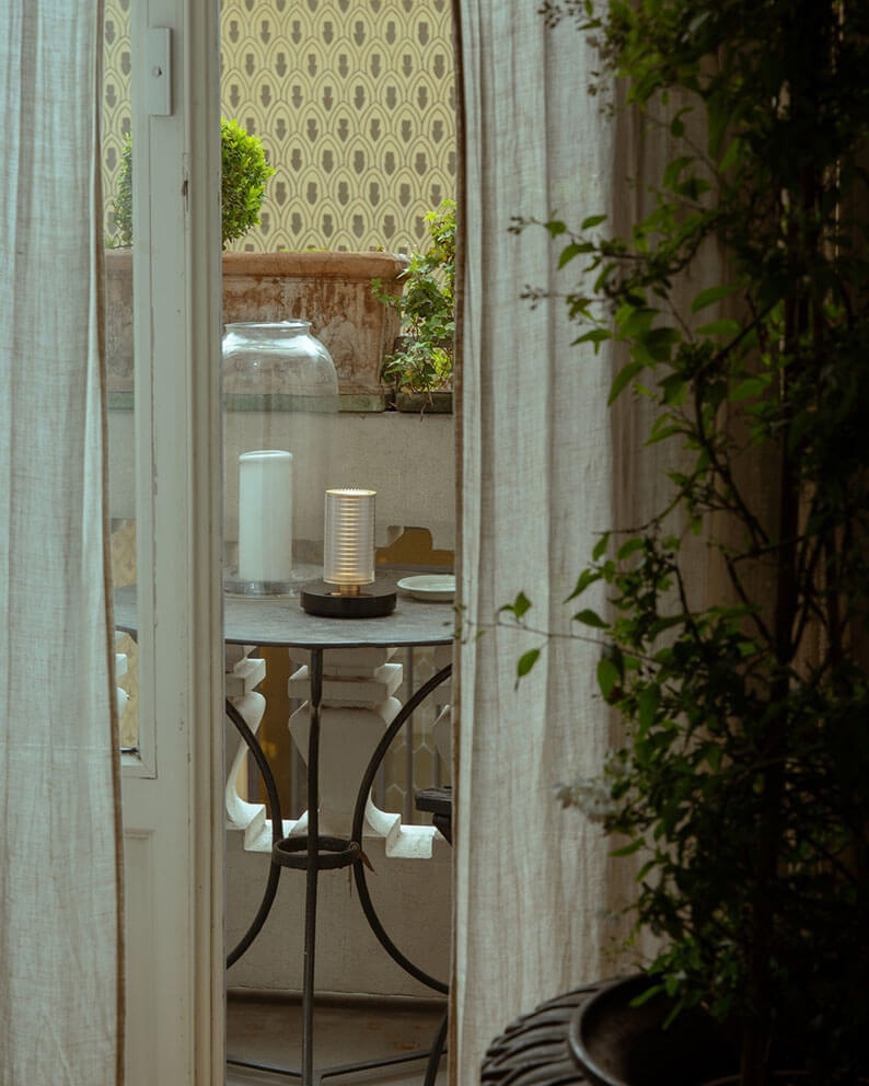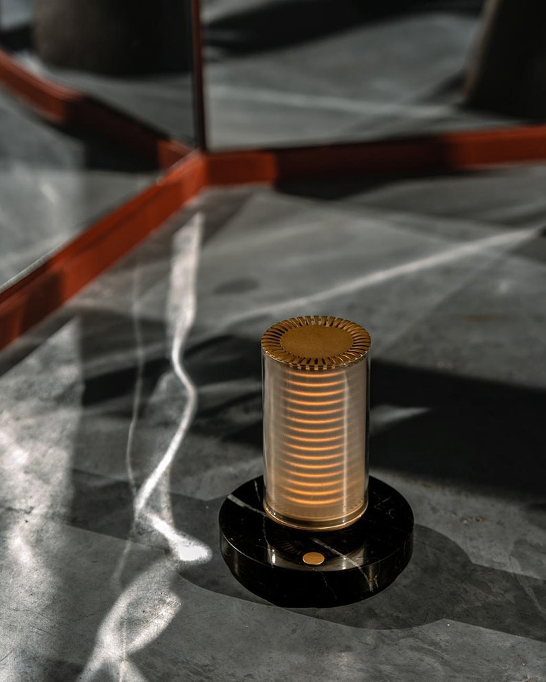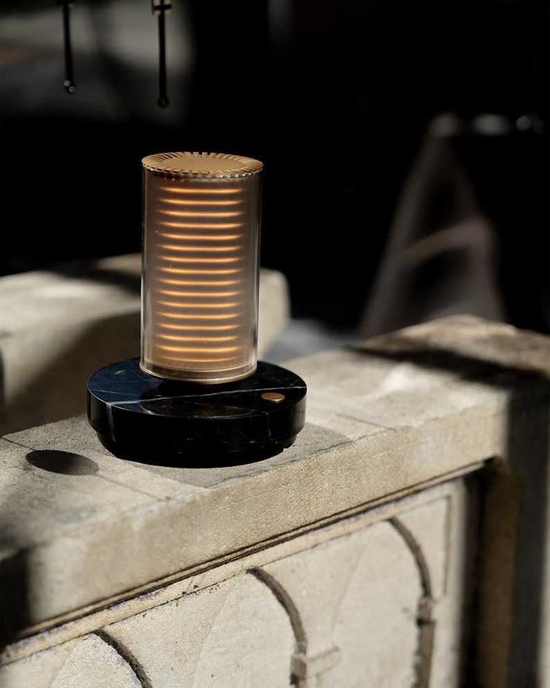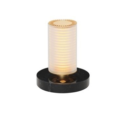 Die wiederaufladbare Akkulampe Frechin A hat ein elegantes und zeitloses Design, das sich gut in viele Einrichtungsstile einfügt. Der Sockel besteht aus schwarzem Marmor und Aluminium, während der Schirm aus einem Rohr aus Borosilikatglas besteht, das wunderschön leuchtet, wenn die Lampe eingeschaltet ist.