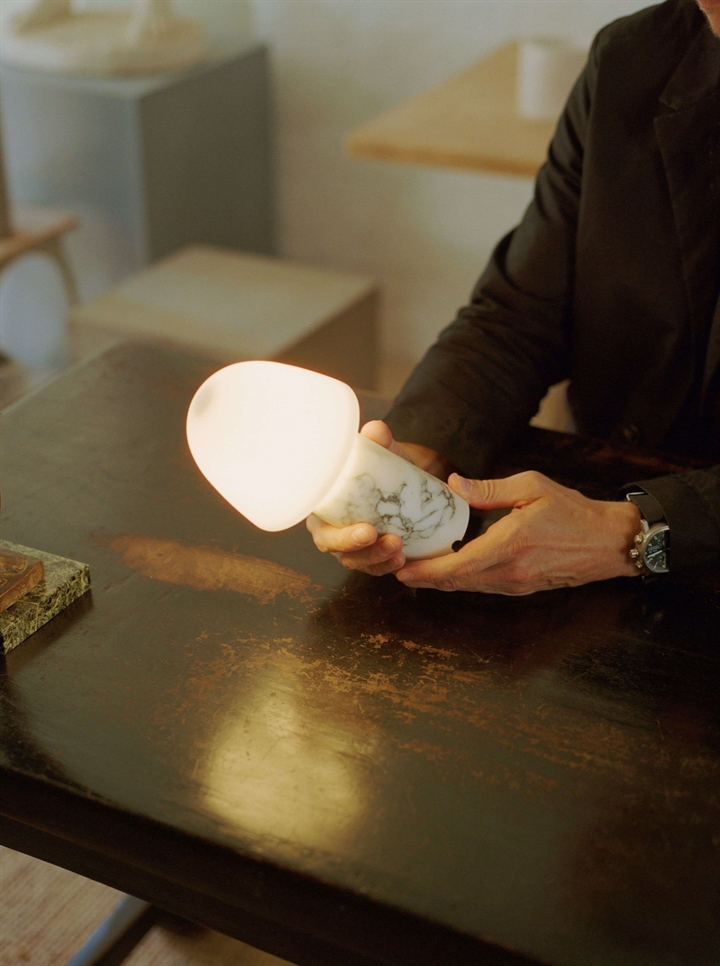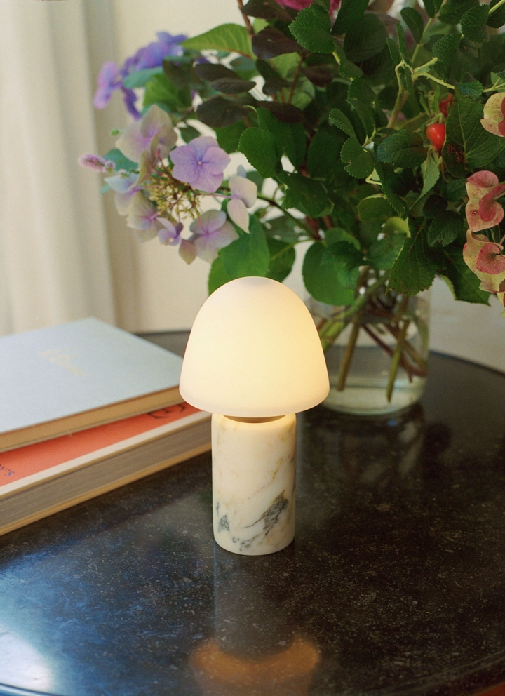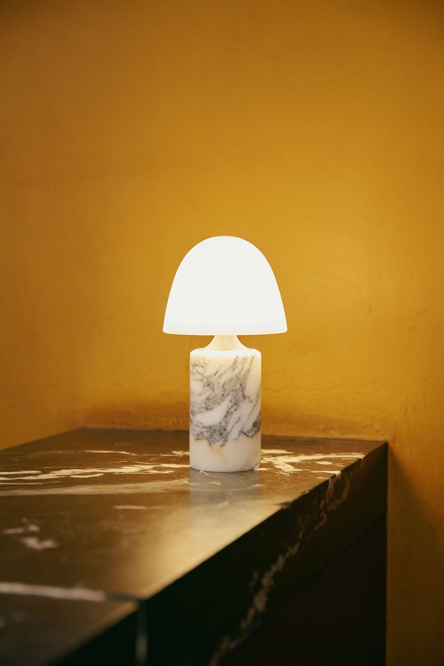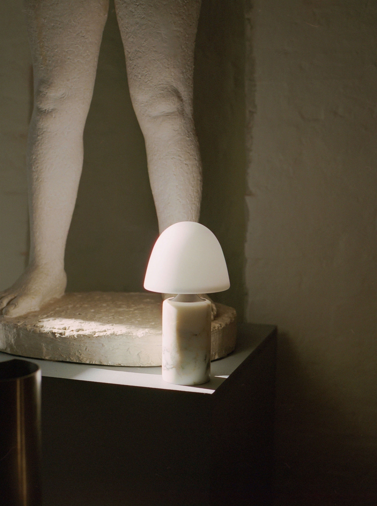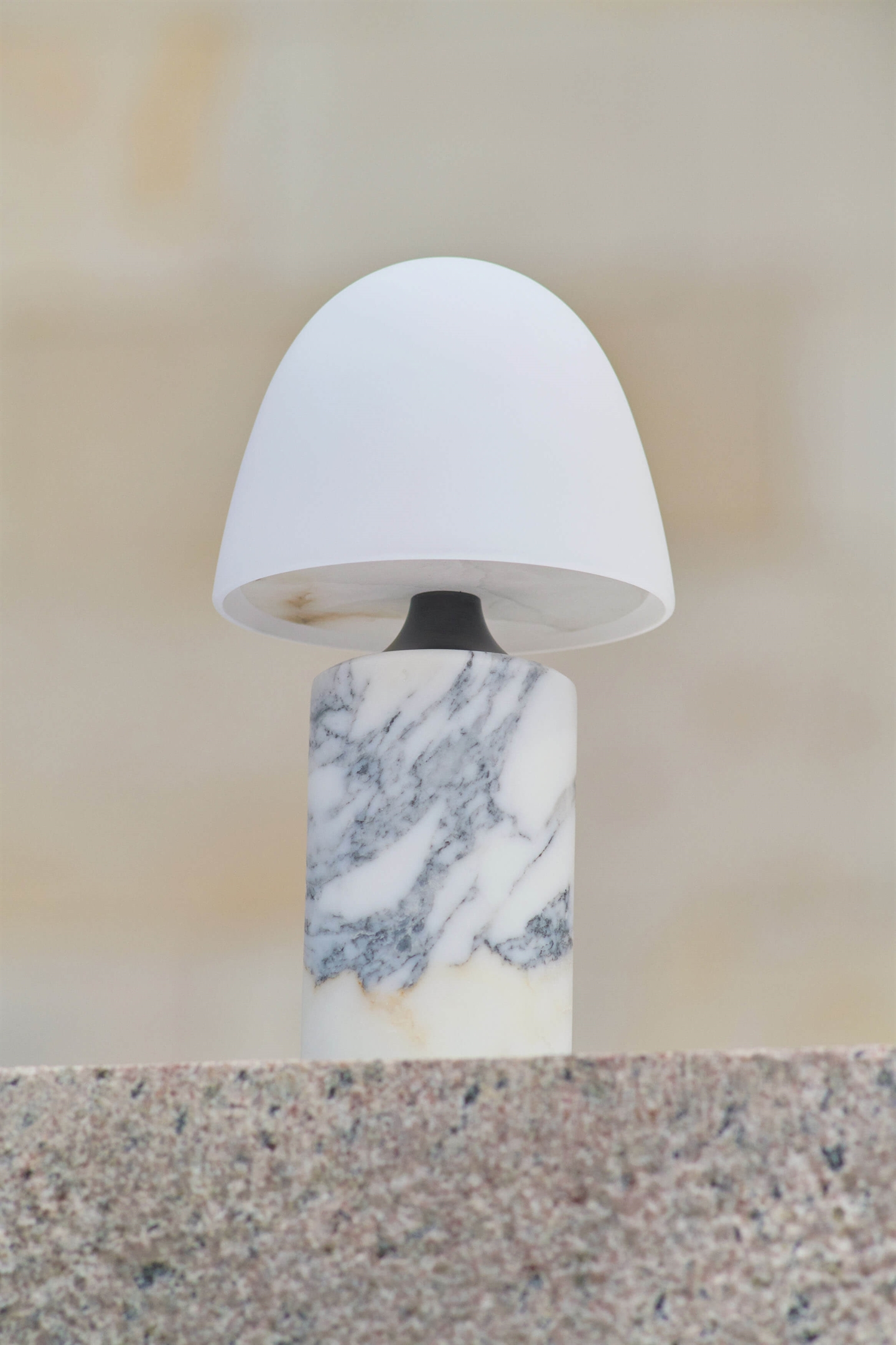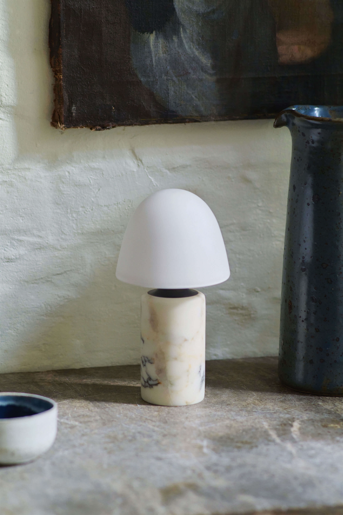 Made by Hand Fuse Portable Akkuleuchte/Tischleuchte aus Marmor, brüniertem Messing, Opalglas und Alabaster - entworfen von Groundwork Studio