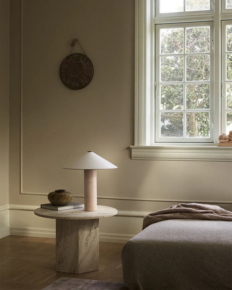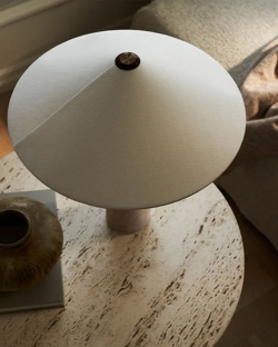 Die Tischlampe Futé 400 ist eine skulpturale Lampe, entworfen vom dänisch-italienischen Designstudio GamFratesi. Die Lampe besteht aus einem weichen Textilschirm, einem eleganten Keramiksockel und einem Metalldetail. Die Tischlampe bietet ein sanftes Licht, das in drei Stufen gedimmt werden kann und über eine Touch-Funktion an der Oberseite ein- und ausgeschaltet wird.