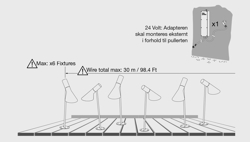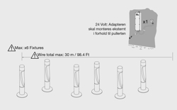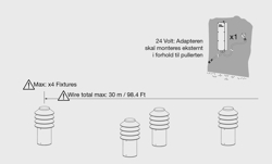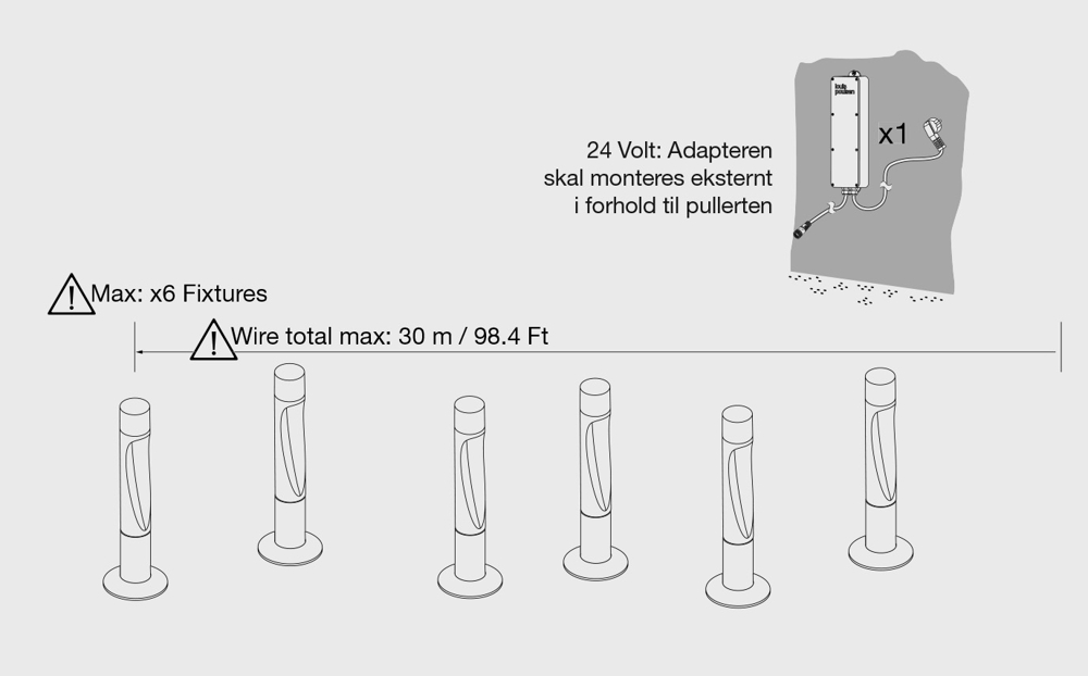 Der Adapter (60W) muss extern im Verhältnis zum Poller montiert werden. Es können bis zu vier Bysted Garden Pollerleuchten, bis zu sechs Flindt Garden Pollerleuchten oder bis zu sechs AJ Garden Pollerleuchten an den Adapter angeschlossen werden.