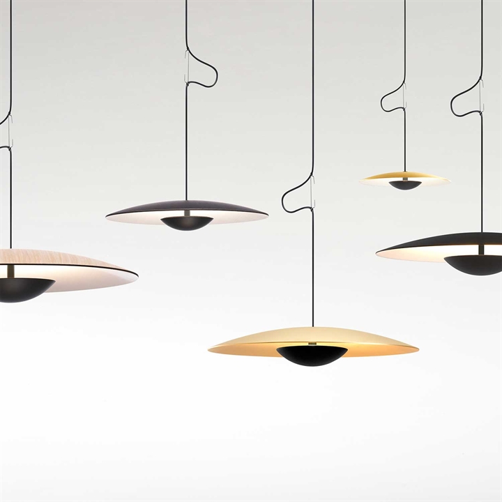 Die Pendelleuchte ist in Gold/Weiß & Gold erhältlich, kann aber auch in Schwarz, Weiß & Eichen- oder Wengeholz bestellt werden.