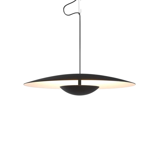Diese Variante der Ginger Pendelleuchte hat einen schwarzen Schirm und eine weiße Innenseite, die in jedem Raum ein angenehmes Licht erzeugt.