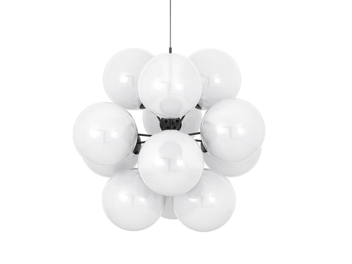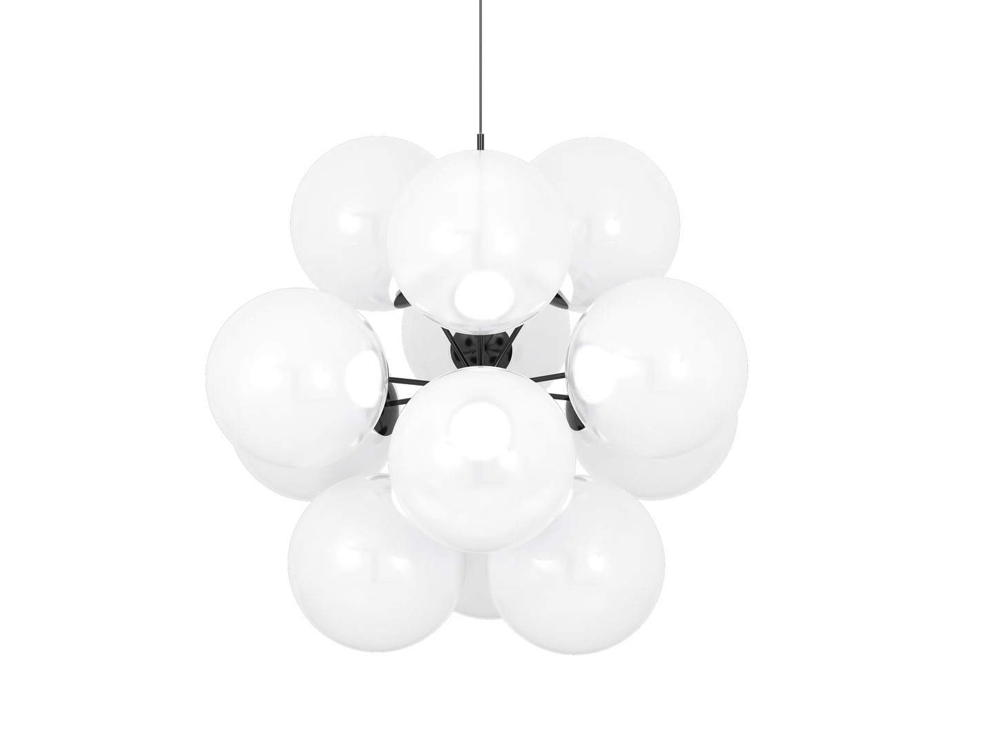 Globe Burst ist ein außergewöhnlicher Kronleuchter mit 12 getönten opalweißen Schirmen, die perfekte leuchtende Kugeln bilden, wenn er eingeschaltet ist, und mit matten Oberflächen erscheinen, wenn er ausgeschaltet ist. Der Kronleuchter strahlt ein weiches Licht aus dem skulpturalen Design aus und kann beispielsweise über dem Esstisch oder als schönes Element in einem Raum mit hoher Decke platziert werden.