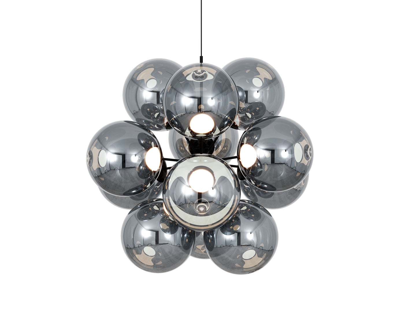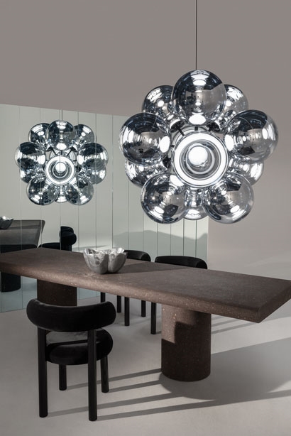 Globe Burst ist ein außergewöhnlicher Kronleuchter mit 12 Schirmen, die eine spezielle metallisierte Oberfläche mit Spiegeleffekt haben, wenn die Lampe ausgeschaltet ist, und mit schönen internen Reflexionen von den integrierten Lichtquellen, wenn sie eingeschaltet ist. Der Kronleuchter strahlt ein weiches Licht aus dem skulpturalen Design aus und kann beispielsweise über dem Esstisch oder als schönes Element in einem Raum mit hoher Decke platziert werden.