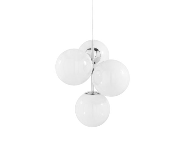 Dieser mini Kronleuchter der Globe-Serie hat ein kompaktes Design, das es ermöglicht, einen Kronleuchter auch an Orten mit wenig Platz oder niedrigen Decken zu verwenden. Die vier getönten opalweißen Schirme bilden perfekte beleuchtete Kugeln, wenn der Kronleuchter eingeschaltet ist, und erscheinen mit einer matten Oberfläche, wenn er ausgeschaltet ist. Der elegante Kronleuchter strahlt ein angenehmes dimmbares Licht aus und passt gut über den Esstisch.