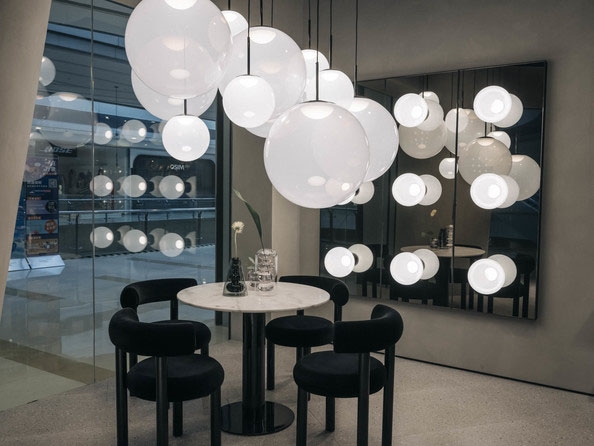 Tom Dixons Globe-Serie umfasst Pendelleuchten, Wandleuchten, Tischlampen, Stehlampen und Kronleuchter.