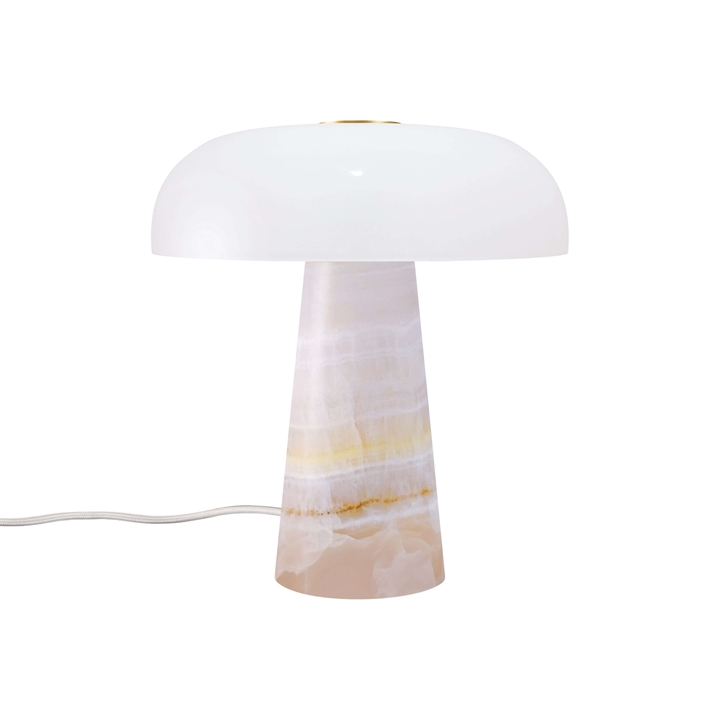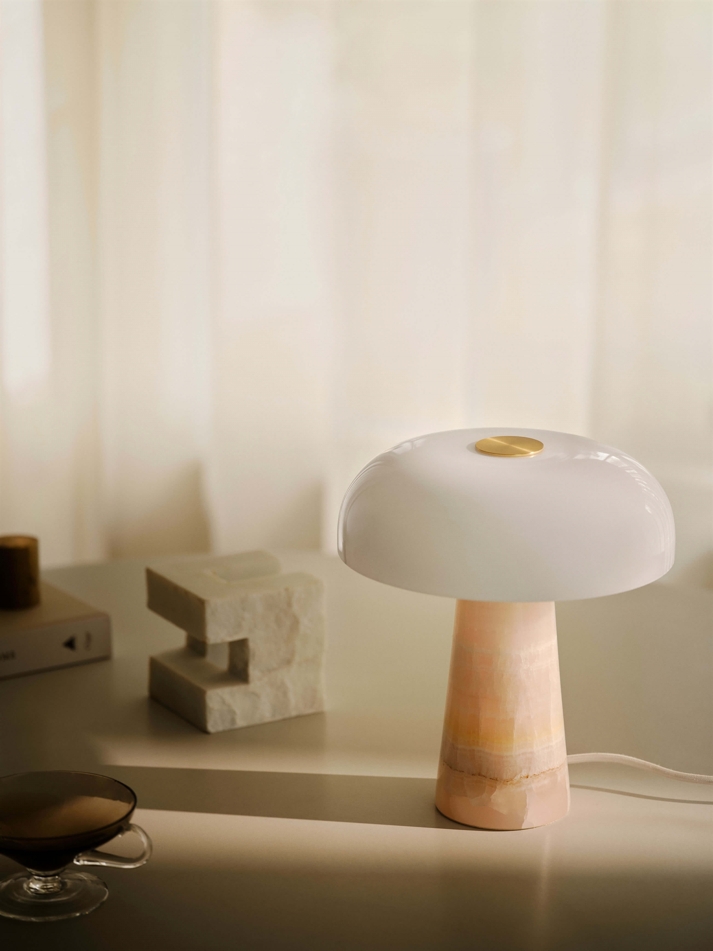 Glossy Mini ist eine elegante Tischleuchte mit einem schönen Sockel aus rosa Jade und einem Oberteil aus gebürstetem Messing. Die Lampe wurde von der dänischen Designerin Maria Berntsen entworfen, die ein minimalistisches nordisches Design mit hochwertigen Materialien schaffen wollte, das jede Lampe einzigartig macht.
