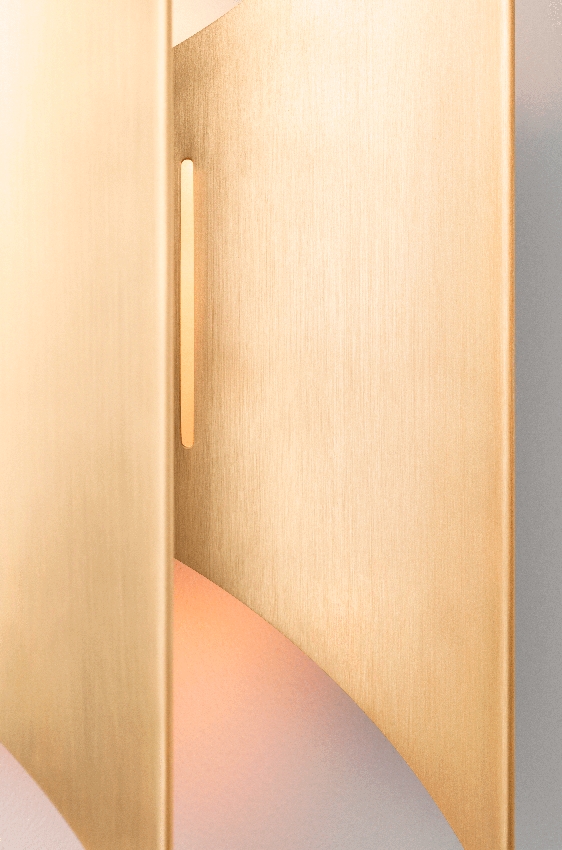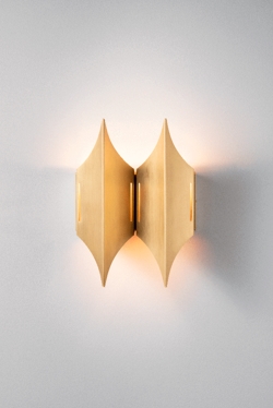 Die Gothic Wandleuchte ist voller Charakter und hat mit ihren zwei langen Lampenschirmen mit Spitzbögen eine dekorative Abstufung an der Wand. Die Wandleuchte besteht aus einem Messinggestell, das ein sanftes, nach oben gerichtetes Licht abgibt, das aufgrund der kleinen Löcher in der Oberfläche des Schirms ein schönes Muster an der Wand hinterlässt. An der Wand entstehen kleine organische und wellenförmige Formen.