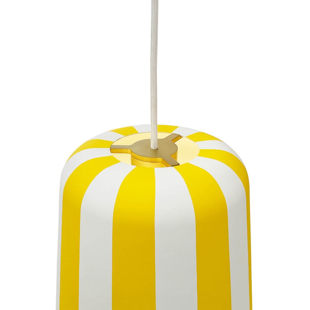 Die Gry Pendelleuchte ist ein dänisches Design aus weißem Metall mit farbigen Streifen und einem Messingdetail an der Spitze. Das Design ist unter anderem inspiriert von bunten Karussells, Riesenrädern, Heißluftballons und Lutschern, mit dem Wunsch, eine fröhliche Lampe zu schaffen, die Menschen zum Lächeln bringt.