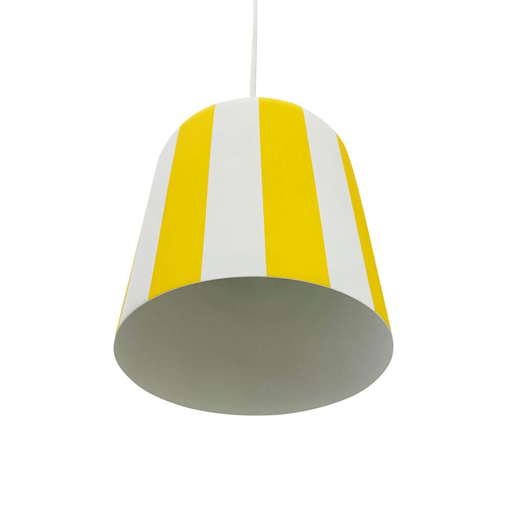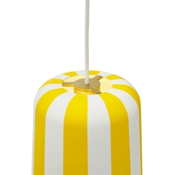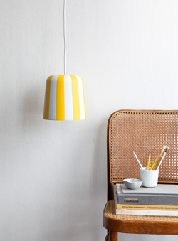 Die Gry Pendelleuchte ist in Weiß mit Streifen in Rot, Gelb oder Grau erhältlich und als Tischlampe in denselben Farben.