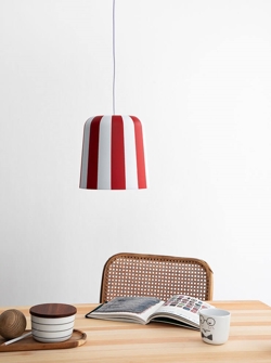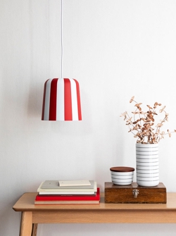 Die Gry Pendelleuchte ist in Weiß mit Streifen in Rot, Gelb oder Grau erhältlich und als Tischlampe in denselben Farben.