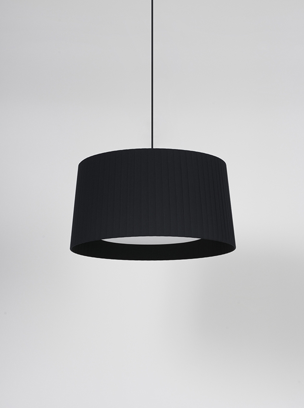 Der Schirm der GT5 Pendelleuchte besteht aus Buchbinderstoff und ist mit Bändern aus Pergamentstoff bezogen. Diese Konstruktion sorgt für eine abwechslungsreiche Beleuchtung, und wenn die Lampe nicht eingeschaltet ist, dient sie gleichzeitig als dekoratives Element.