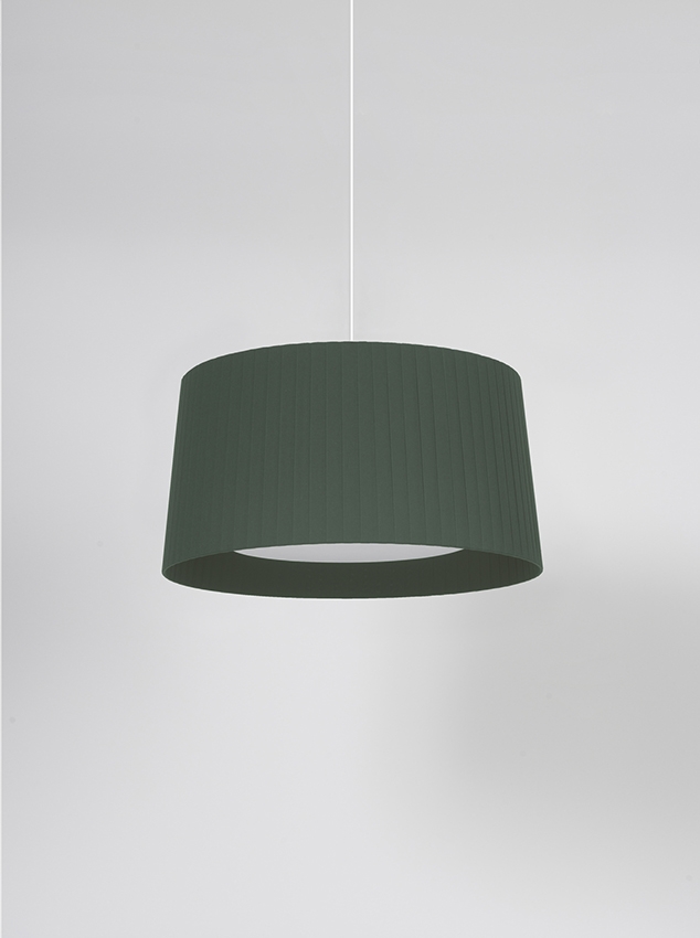 Der Schirm der GT5 Pendelleuchte besteht aus Buchbinderstoff und ist mit Bändern aus Pergamentstoff bezogen. Diese Konstruktion sorgt für eine abwechslungsreiche Beleuchtung, und wenn die Lampe nicht eingeschaltet ist, dient sie gleichzeitig als dekoratives Element.