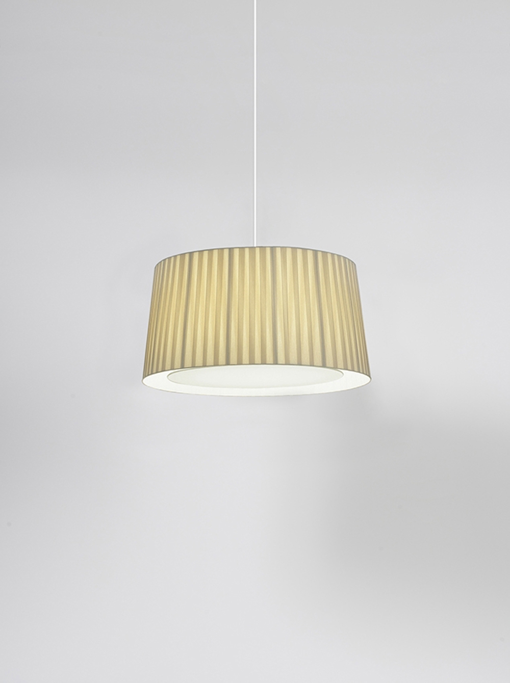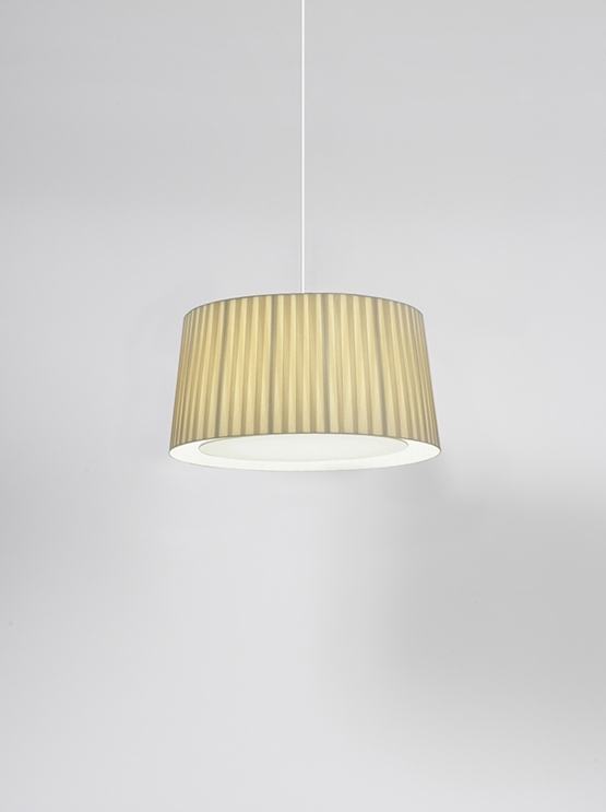 Der Schirm der GT6 Pendelleuchte besteht aus Buchbinderstoff und ist mit Bändern aus Pergamentstoff bezogen. Diese Konstruktion sorgt für eine abwechslungsreiche Beleuchtung, und wenn die Lampe nicht eingeschaltet ist, dient sie gleichzeitig als dekoratives Element.