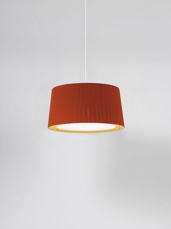 Der Schirm der GT6 Pendelleuchte besteht aus Buchbinderstoff und ist mit Bändern aus Pergamentstoff bezogen. Diese Konstruktion sorgt für eine abwechslungsreiche Beleuchtung, und wenn die Lampe nicht eingeschaltet ist, dient sie gleichzeitig als dekoratives Element.