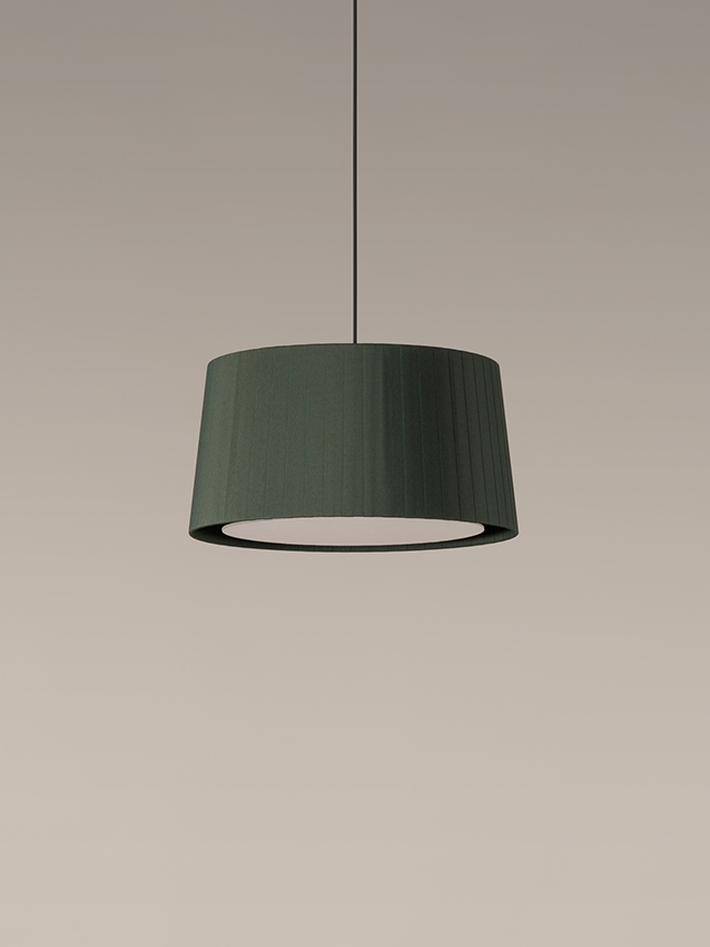 Der Schirm der GT6 Pendelleuchte besteht aus Buchbinderstoff und ist mit Bändern aus Pergamentstoff bezogen. Diese Konstruktion sorgt für eine abwechslungsreiche Beleuchtung, und wenn die Lampe nicht eingeschaltet ist, dient sie gleichzeitig als dekoratives Element.