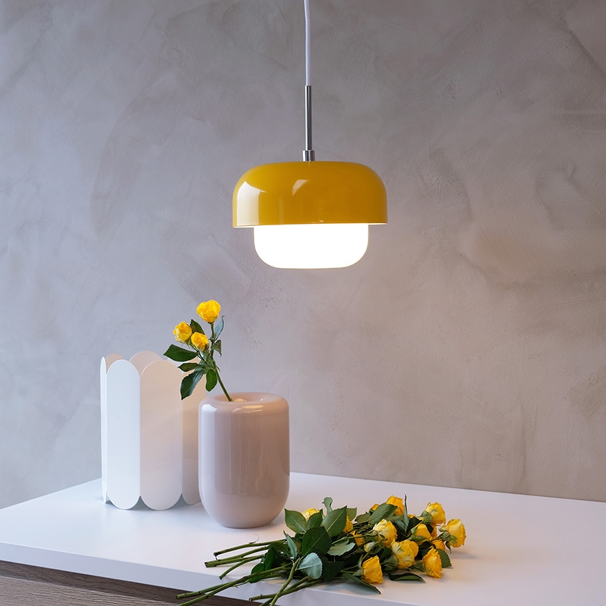 Die schöne gelbe Farbe und das Design der Lampe sind inspiriert von Japans Farbuniversum und Australiens wunderschönen Farben. Die Lampe hat eine elegante Metalloberseite mit passendem Baldachin und einen Schirm aus mundgeblasenem Opalglas, der eine schöne Lichtverteilung bietet.