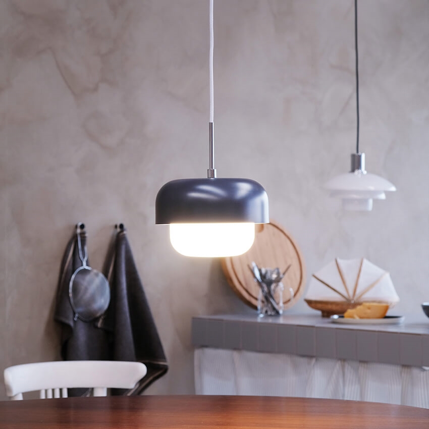Die Pendelleuchte funktioniert sowohl allein als auch in Gruppen mit anderen Lampen über dem Küchen- oder Esstisch.