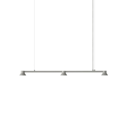 Die Hat-Lampe verdankt ihren Namen ihrer charakteristischen Form. Diese Kollektion umfasst sowohl Pendelleuchten als auch lineare Lampen in verschiedenen Größen. Beide Varianten verfügen über eine einzigartige Kegelform des Lampenschirms, die einen großzügigen Strahl direkten Lichts nach unten abgibt.