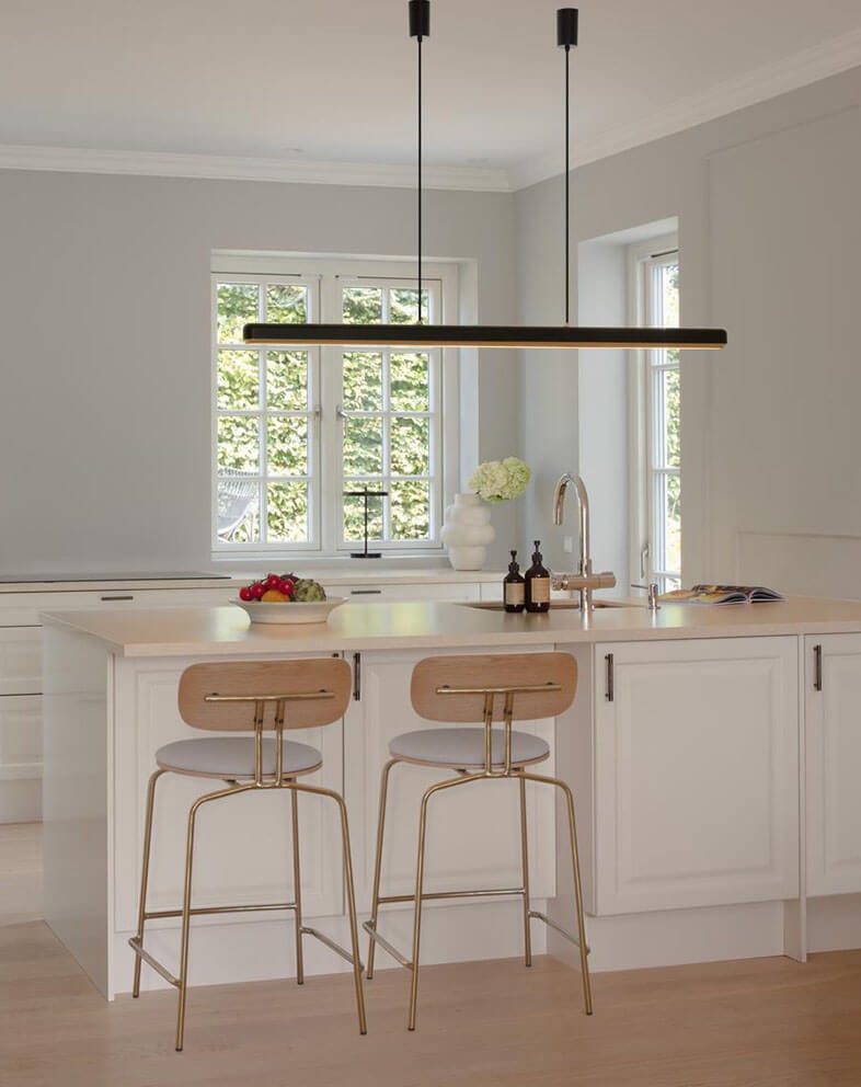 Hazel Branch ist mit ihrem schlanken Design ideal als Beleuchtung über dem Esstisch und kann auch als Küchenpendel oder beispielsweise in einem Konferenzraum verwendet werden. Die längliche Lampe ist sowohl funktional als auch elegant mit einer blendfreien LED-Lichtquelle und ermöglicht die Einstellung der Farbtemperatur und Helligkeit des Lichts über zwei Knöpfe oben am Schirm.