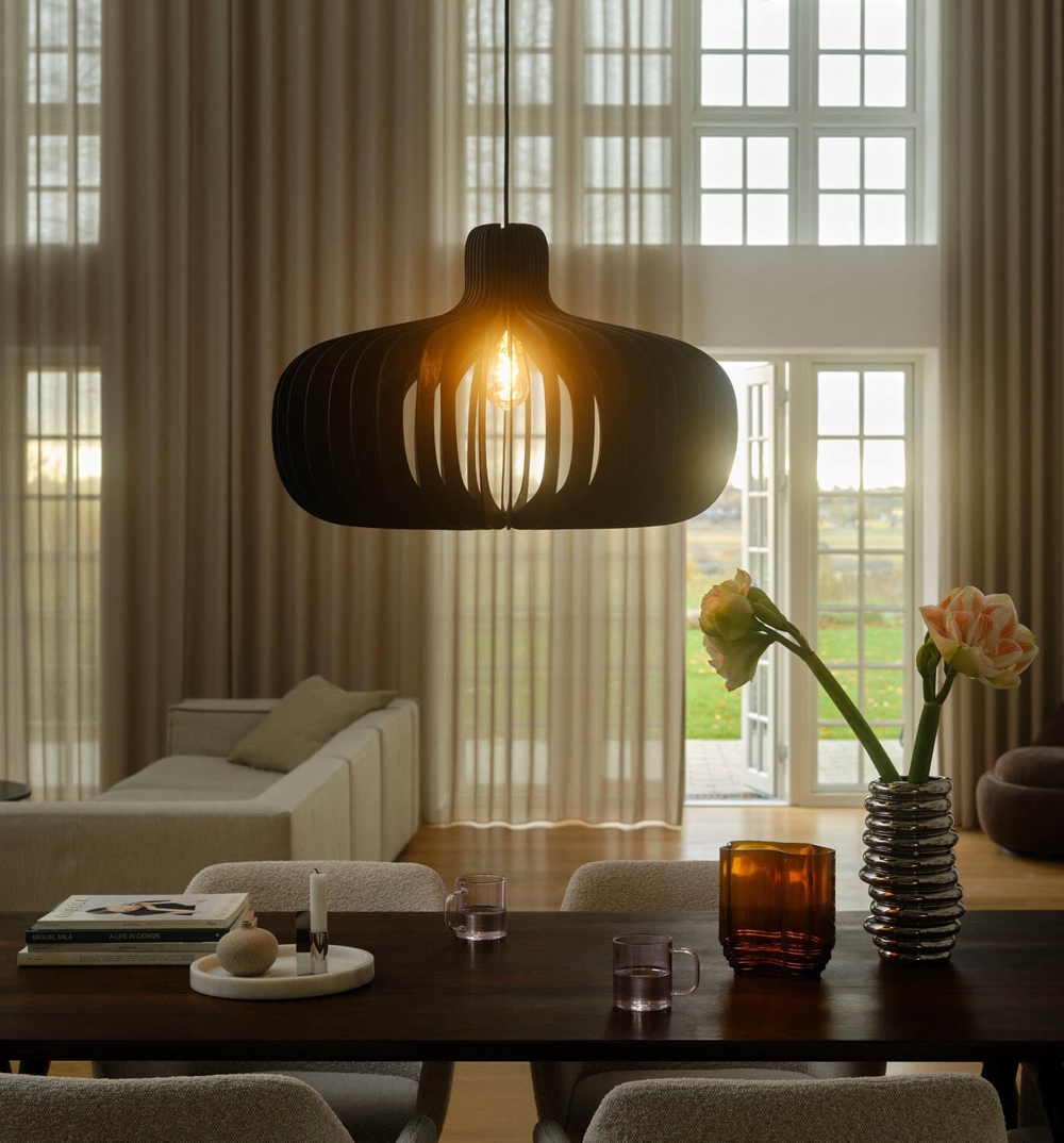 Hazo ist eine leichte Pendelleuchte, bei der die organischen Formen mit der eleganten Struktur aus FSC-zertifiziertem Holz hervortreten. Ein leichtes Design der Lampe trägt dazu bei, ein dekoratives Licht in den Raum zu werfen, wo das Zusammenspiel von Licht und Schatten erlebt wird. Verwenden Sie eventuell eine dekorative Glühbirne, um einen anderen Ausdruck in der Lampe zu erzielen.