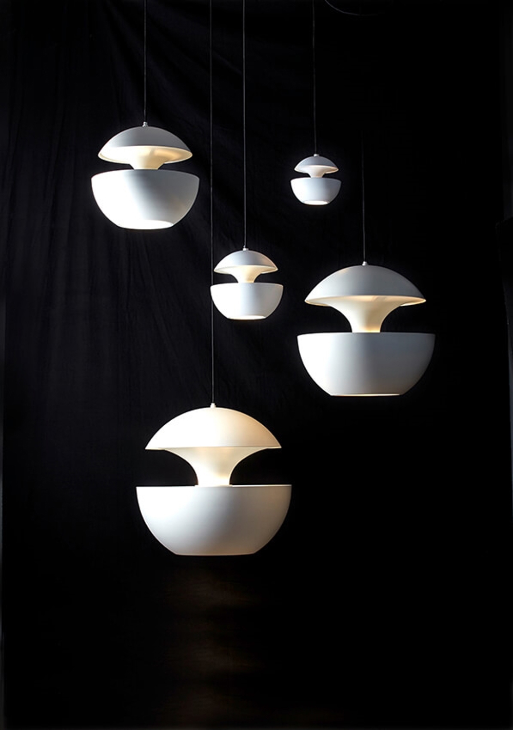 Here Comes The Sun ist in 6 verschiedenen Größen in Schwarz/Weiß, Weiß, Schwarz/Kupfer oder Weiß/Kupfer erhältlich. Die beiden größten Pendelleuchten sind jedoch auch in Weiß/Rosa Kupfer und Schwarz/Rosa Kupfer erhältlich.
