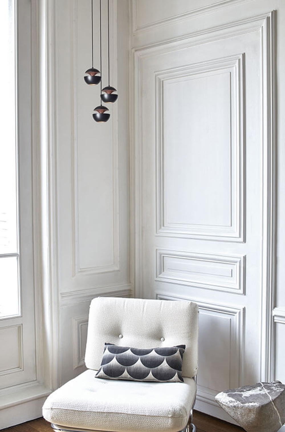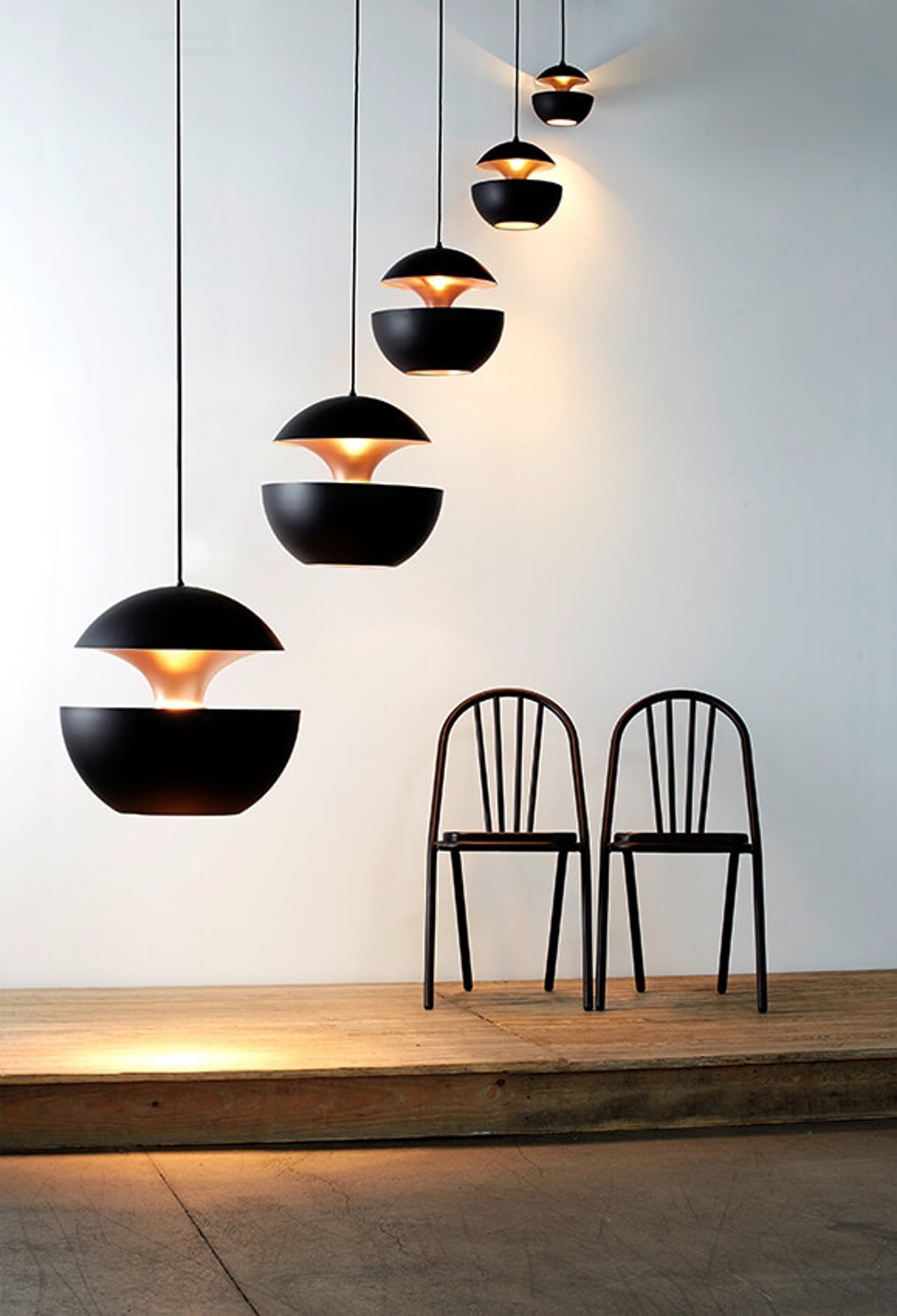 Here Comes The Sun ist in 6 verschiedenen Größen in schwarz/weiß, weiß, schwarz/kupfer oder weiß/kupfer erhältlich. Die beiden größten Pendelleuchten sind jedoch auch in weiß/rosa kupfer und schwarz/rosa kupfer erhältlich.