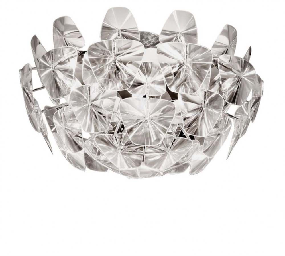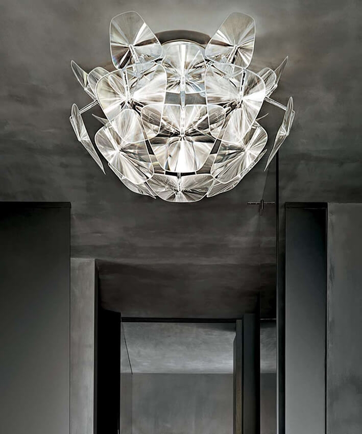 Hope ist inspiriert von traditionellen Kronleuchtern, die von Luceplan neu interpretiert wurden. Die Hope Deckenleuchte besteht aus Materialien wie Polycarbonat, wobei die Struktur der Schirme aus poliertem Edelstahl gefertigt ist. Darüber hinaus verfügt die Lampe über prismatische Linsen, die das Licht auf kristallartige Weise im Raum reflektieren.
