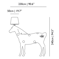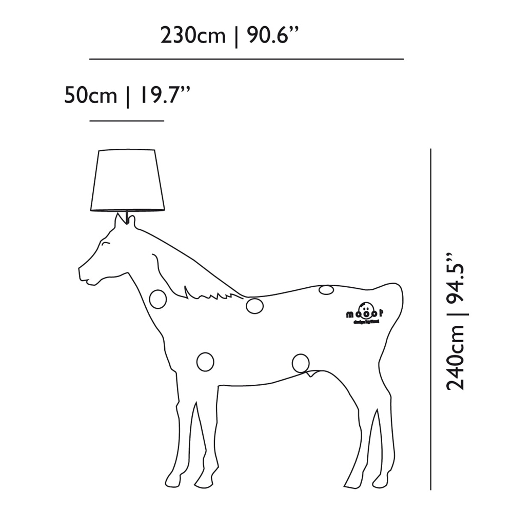 Das Pferd ist aus Polyester auf einem Metallrahmen gefertigt, wobei sich oben auf dem Kopf des Pferdes ein Lampenschirm aus PVC-Viskose befindet. Der Schirm der exklusiven Horselamp hat innen eine silbergraue Farbe, um die optimale Reflexion des Lichts zu erzielen.