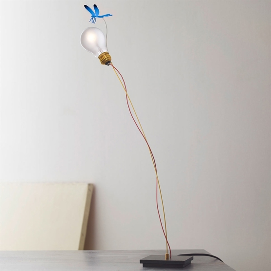 I Ricchi Poveri – Bzzzz Tischlampe besteht aus einer Libelle aus blau eloxiertem Aluminium, Stahl und Messing und einer LED-Birne.