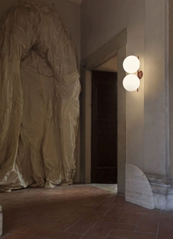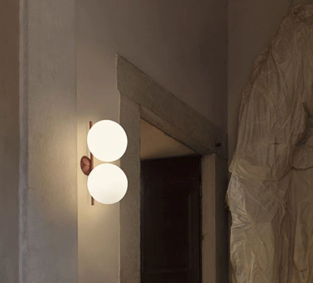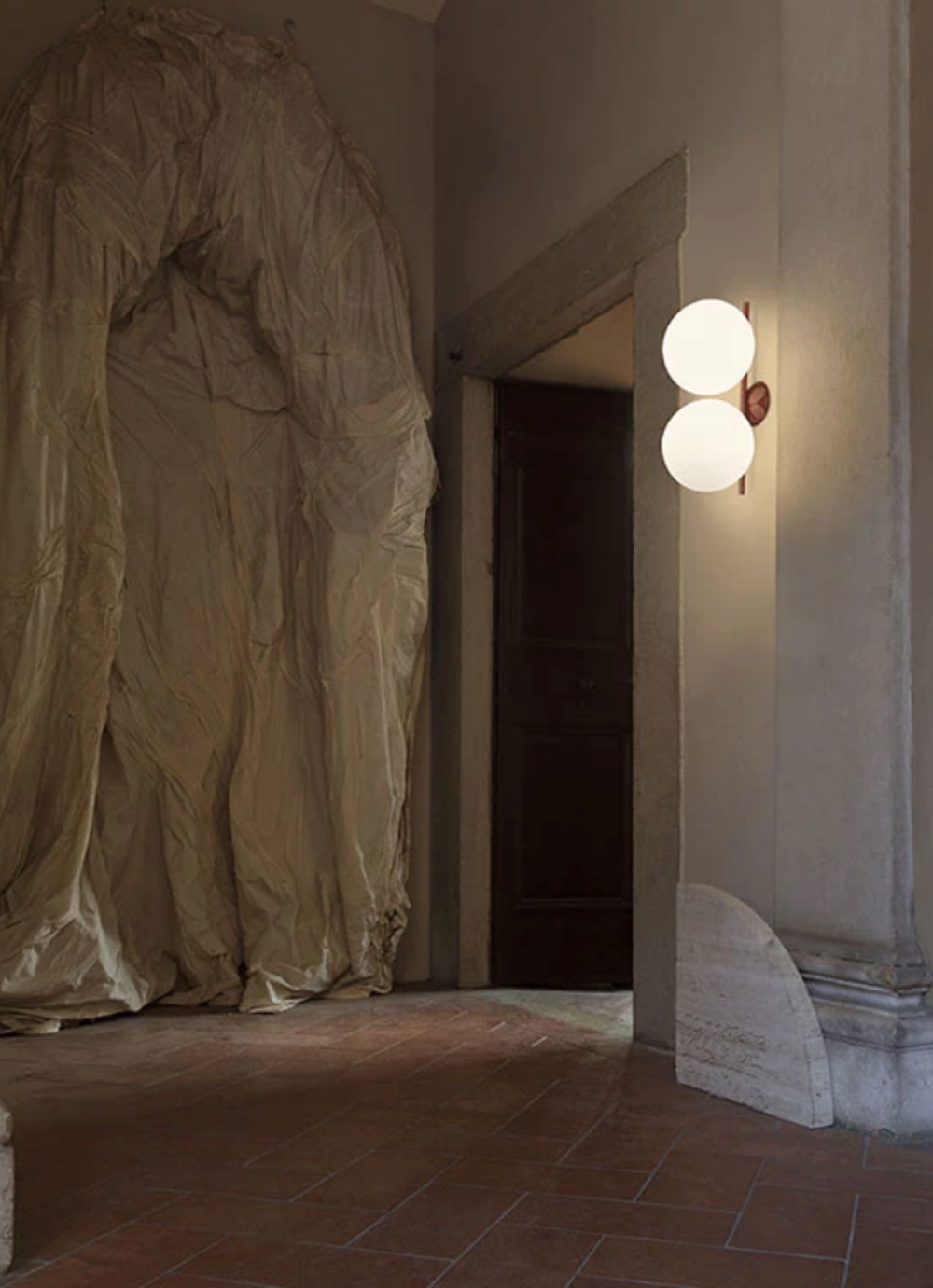 IC Light ist eine Serie von Leuchten, die aus Wand-, Decken-, Steh-, Tischleuchten und Pendelleuchten besteht, mit Materialien in matt Messing, Chrom, matt Schwarz und Weinrot mit weißem Opalglas.