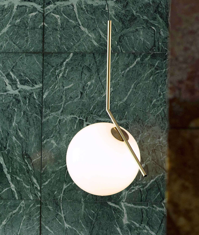 IC Light ist eine Serie von Lampen, die aus Wandleuchten, Deckenleuchten, Stehleuchten, Tischleuchten und Pendelleuchten besteht, wobei das Material in matt Messing, Chrom oder matt Schwarz mit weißem Opalglas erhältlich ist.