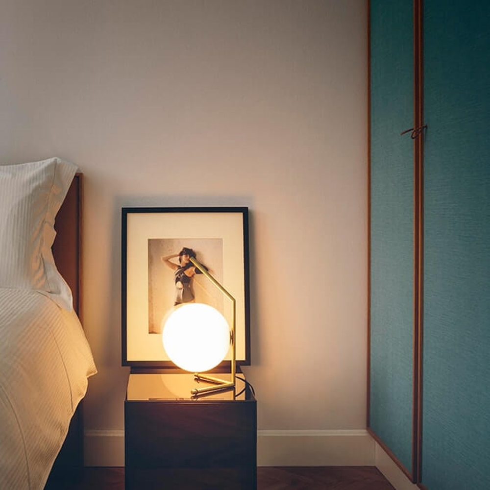 IC Light ist eine Serie von Lampen, die aus Wandleuchten, Deckenleuchten, Stehleuchten, Tischleuchten und Pendelleuchten, besteht, wobei das Material in mattem Messing, Chrom oder mattem Schwarz mit weißem Opalglas erhältlich ist.