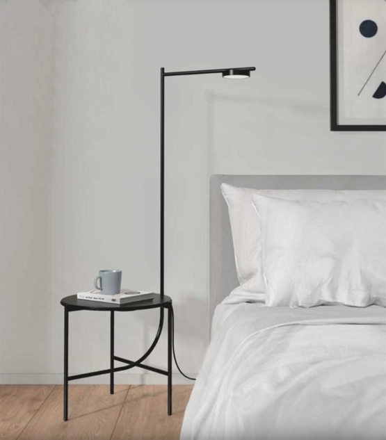 Die Igram Stehlampe und der Tisch haben ein smartes und äußerst funktionales Design, das an vielen verschiedenen Orten im Zuhause und in Hotels eingesetzt werden kann.