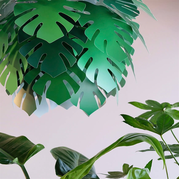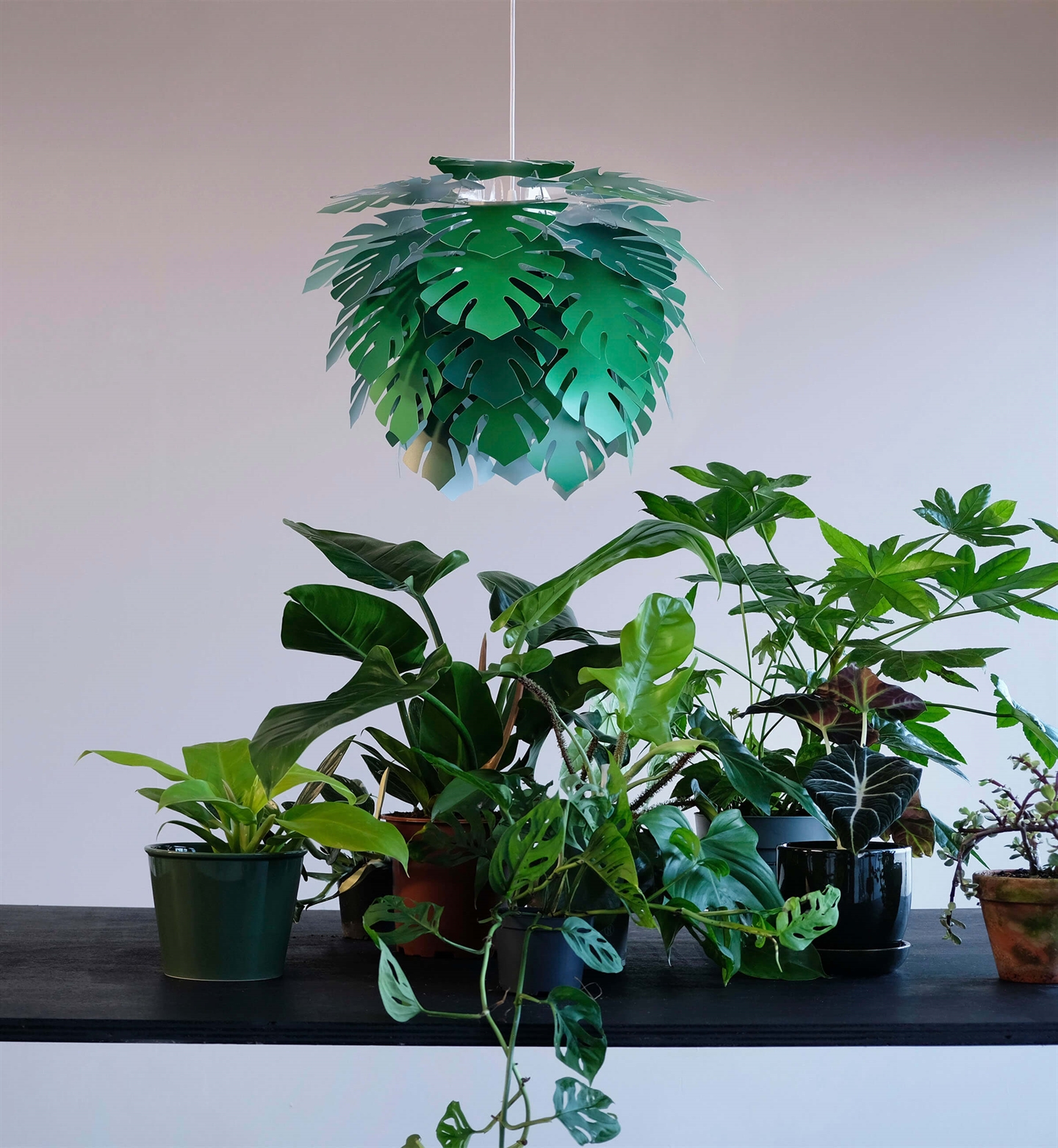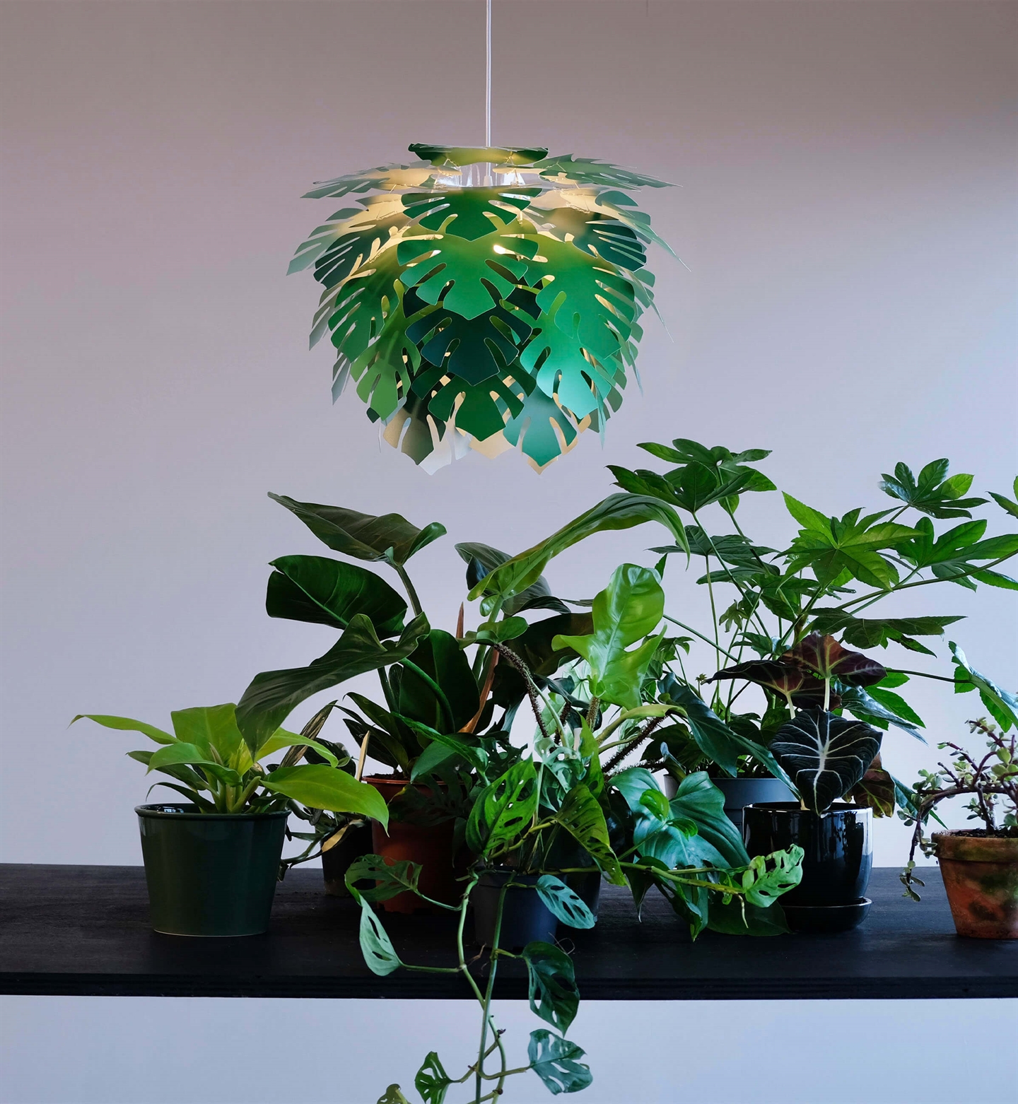 Die Pendelleuchte hat ihren ganz eigenen Ausdruck und ähnelt fast einer Pflanze mit den vielen grünen Blättern, wobei die Inspiration für das Design auch von der Pflanze Philodendron stammt.