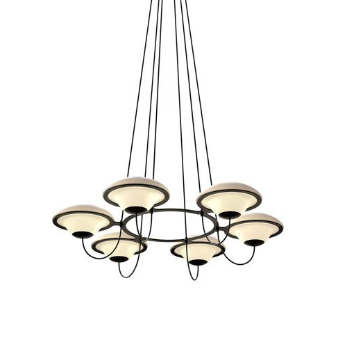 Der Kronleuchter In The Air mit 6 Schirmen aus weißem Opalglas ist inspiriert von nostalgischer Science-Fiction mit futuristischen Fantasien über fliegende Untertassen. Die UFO-ähnlichen Schirme ruhen auf den Stahlkreisen des schwarzen Rahmens und verleihen dem Kronleuchter einen schwebend leichten und modernen Ausdruck.