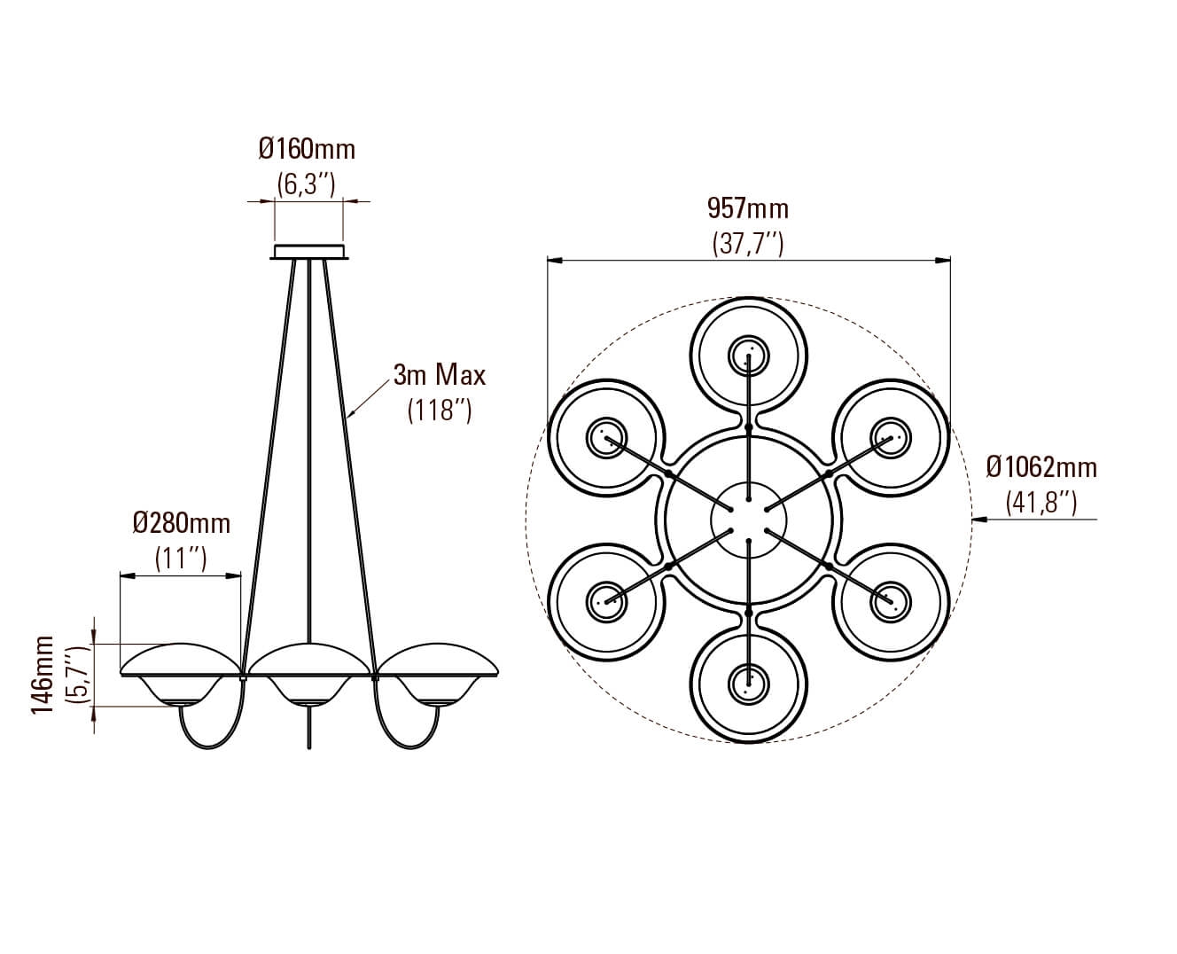 Verwenden Sie In The Air als Beleuchtung über dem Esstisch oder als elegante Ergänzung zur Einrichtung im Flur oder Schlafzimmer. Der Kronleuchter ist mit drei oder sechs Schirmen erhältlich.