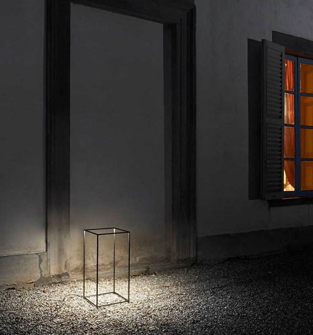 Besteht aus einem Metallrahmen. Gibt es auch als Stehleuchte für den Innenbereich.