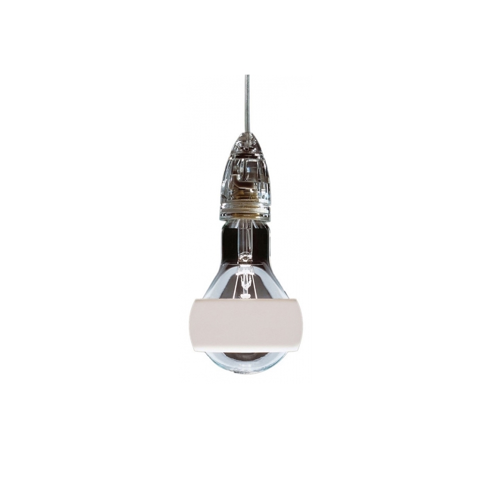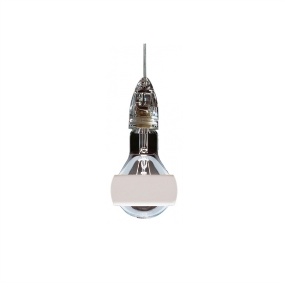 Ingo Maurer Johnny B. Good Pendelleuchte ist eine höhenverstellbare Hängelampe mit spezieller Glühbirne, Ø10 cm, Glasfassung und einem weißen Schirmring aus hitzebeständigem PTFE, Kunststoff.