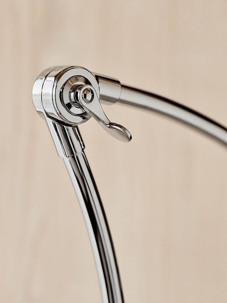 KAISER idell 6559-W ist in drei verschiedenen Farbkombinationen erhältlich – weiß mit verstellbarem Lampenarm in Chrom, schwarz mit Lampenarm in Chrom und matt schwarz mit Lampenarm in Messing.