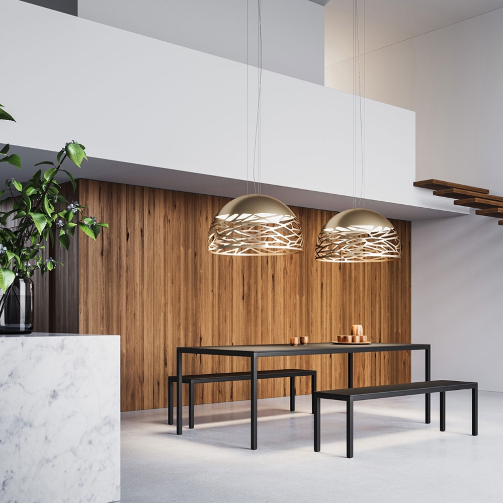 Der lasergeschnittene Schirm der Kelly Dome Pendelleuchte lässt das Licht strömen und erzeugt ein schönes Lichtspiel im Raum. Die Pendelleuchte spendet ein angenehmes Licht und kann daher ideal über dem Esstisch platziert werden.