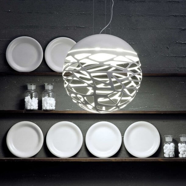 Kelly Sphere besticht durch ein wunderschönes Design mit einem lasergeschnittenen Schirm, der ein einzigartiges Licht und ein schönes Spiel im Raum erzeugt.