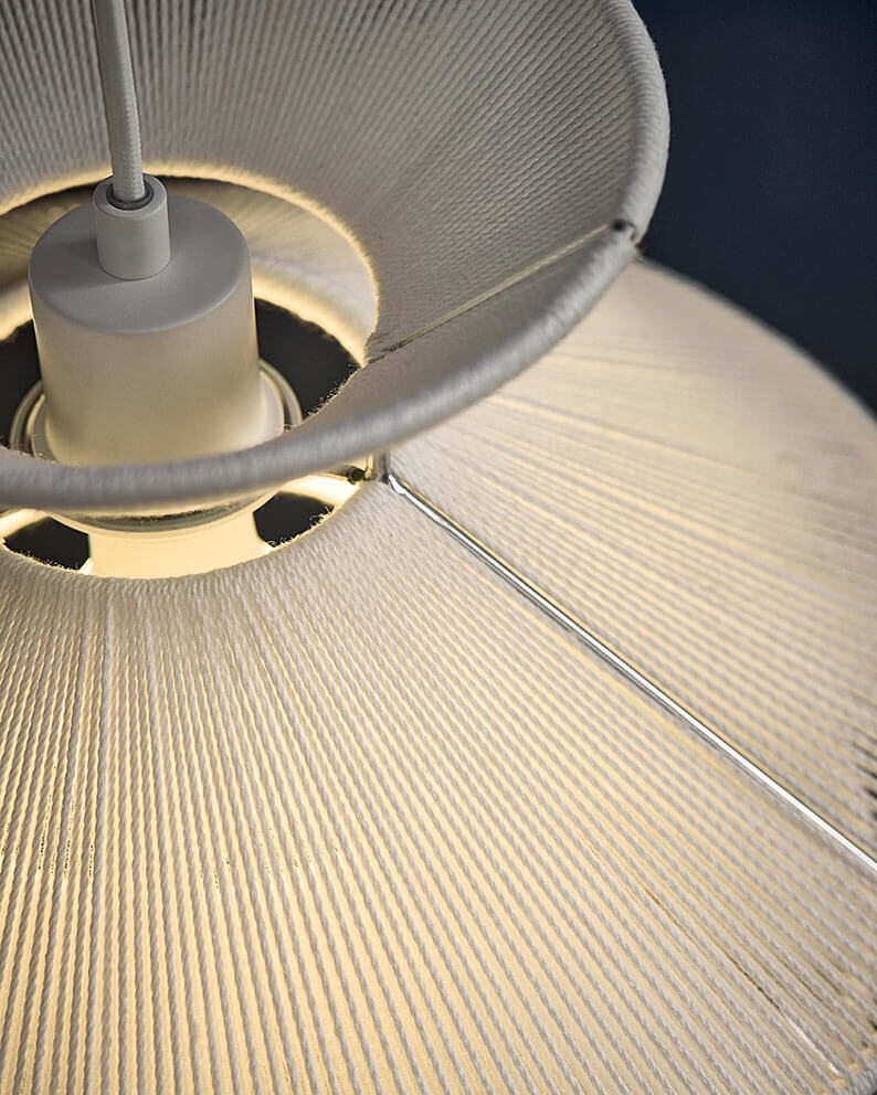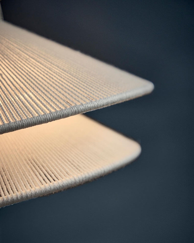 Die Pendelleuchte Kiku ist inspiriert von traditionellen japanischen Samuraihüten und hat mit den einfachen Linien gleichzeitig eine klare Referenz zum skandinavischen Design. Die Kombination aus rostfreiem Stahl und Leinenfäden verleiht der Lampe eine Leichtigkeit im Design, wobei die Fäden im Schirm dazu beitragen, ein weiches und funktionales Licht sowie einen schönen grafischen Lichteffekt auf die Umgebung zu erzeugen.