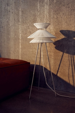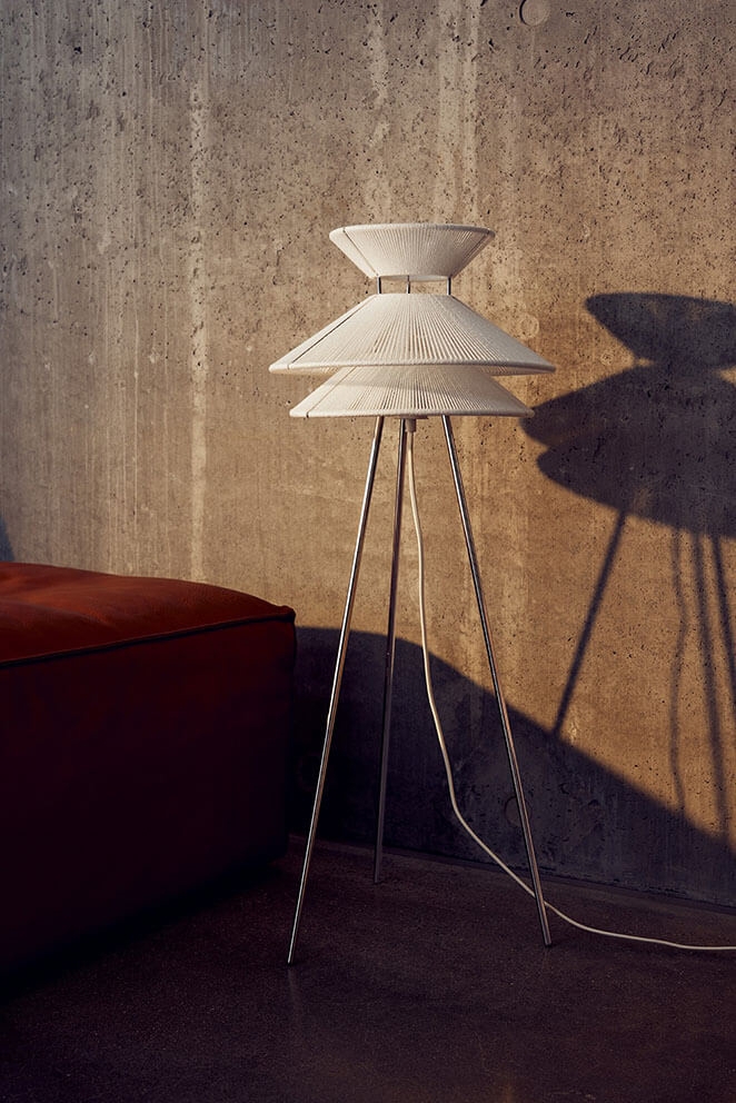 Die Stehlampe Kiku ist inspiriert von traditionellen japanischen Samuraihüten und hat mit den einfachen Linien gleichzeitig eine klare Referenz zum skandinavischen Design. Die Kombination aus rostfreiem Stahl und Leinenfäden verleiht dem Design Leichtigkeit, wobei die Fäden im Schirm dazu beitragen, ein weiches und funktionales Licht sowie einen schönen grafischen Lichteffekt auf die Umgebung zu erzeugen.