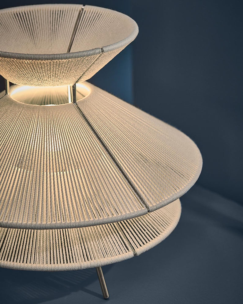 Die Tischlampe Kiku ist inspiriert von traditionellen japanischen Samuraihüten und hat mit den einfachen Linien gleichzeitig eine klare Referenz zum skandinavischen Design. Die Kombination aus rostfreiem Stahl und Leinenfäden verleiht der Lampe eine Leichtigkeit im Design, wobei die Fäden im Schirm dazu beitragen, ein weiches und funktionales Licht sowie einen schönen grafischen Lichteffekt auf die Umgebung zu erzeugen. Dimmschalter am Kabel.