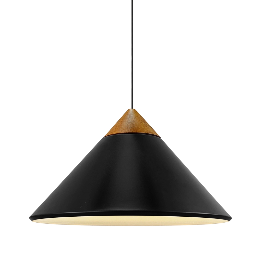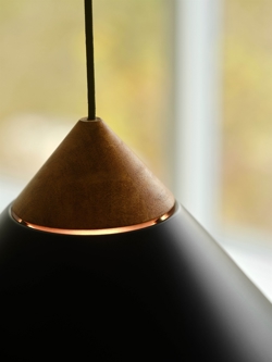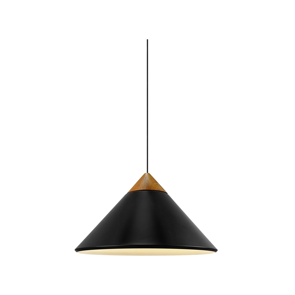 Die Pendelleuchte Kinto hat ein modernes und minimalistisches Design mit einem kegelförmigen Schirm, der perfekt über dem Esstisch oder Küchentisch passt. Neben einem funktionalen, nach unten gerichteten Licht wird das Licht auch durch die Öffnung an der Oberseite des Schirms nach oben gesendet und erzeugt einen schönen Lichteffekt. Die Pendelleuchte ist aus Metall mit einem eleganten oberen Teil aus dunklem Holz und Details in brüniertem Messing.