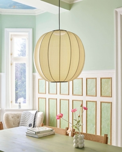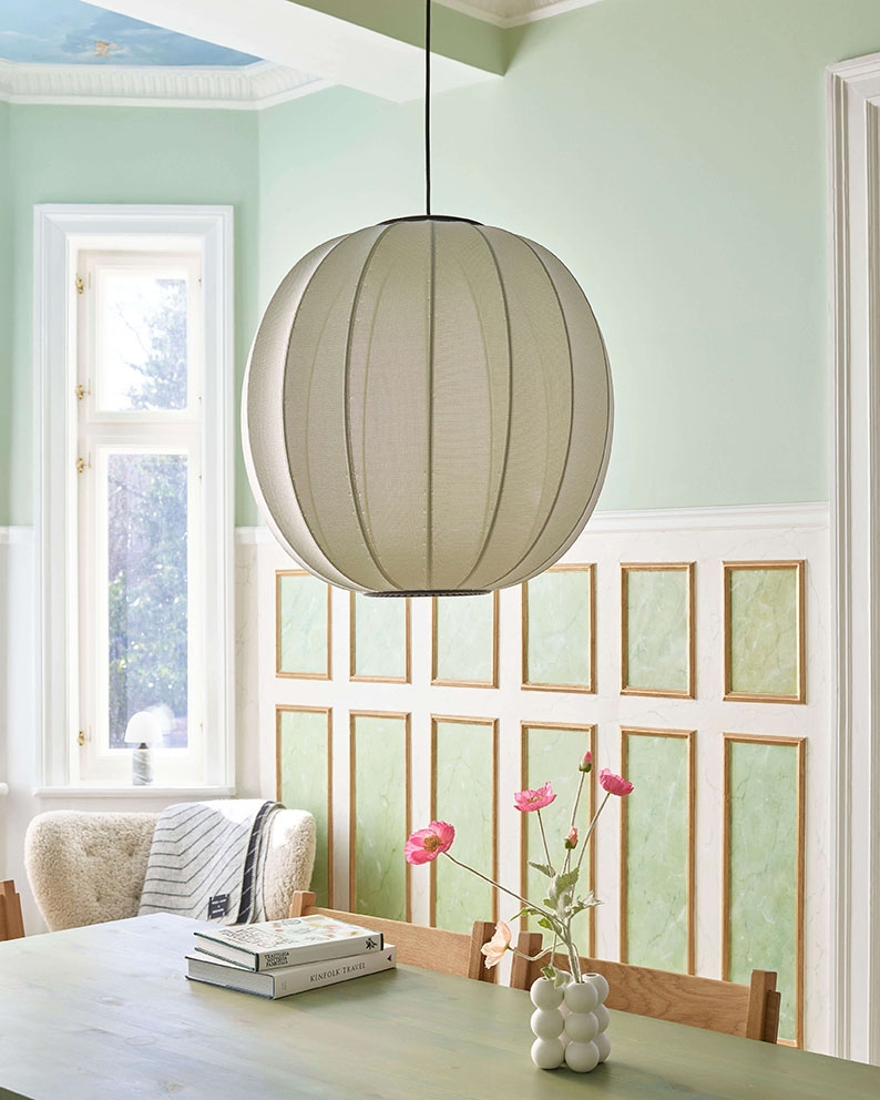 Die Pendelleuchte hat eine integrierte LED-Lichtquelle und ist auch mit E27-Fassung für eine Glühbirne erhältlich. Die Lampenserie umfasst Pendelleuchten, Stehleuchten, Wandleuchten und Deckenleuchten.