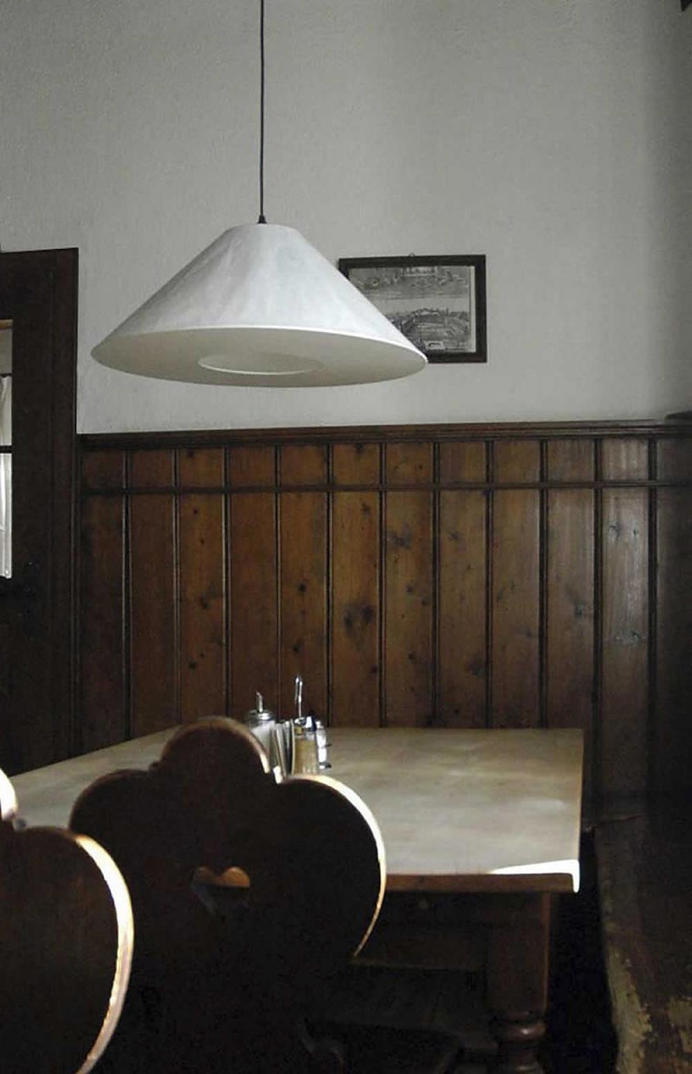 Knitterling Pendelleuchte gibt es - wie hier - ohne Unterschirm sowie in einer anderen Variante mit Unterschirm. Die Lampe mit Unterschirm ist für den Einsatz gedacht, wo man oft nach oben zum Schirm schauen muss - z.B. wenn die Pendelleuchte recht hoch hängt.