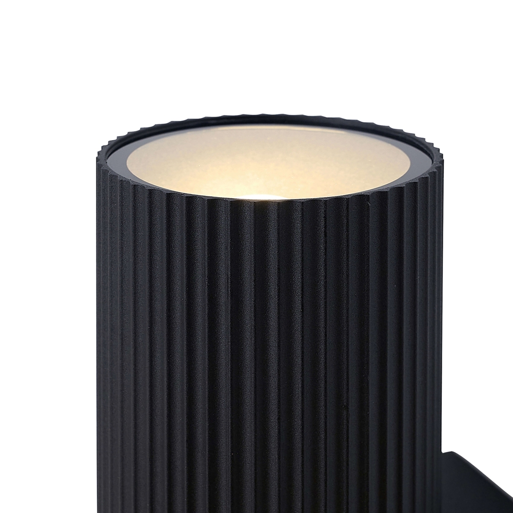 Die elegante Kyklop Ripple Maxi Außenwandleuchte ist dänisches Design mit einer schönen geriffelten Oberfläche aus schwarzem Aluminium. Eine stilvolle Wandleuchte mit modernem Ausdruck, die gut zu vielen Außenbereichen passt. Sie hat sowohl nach oben als auch nach unten gerichtetes Licht, das ein schönes Lichtspiel an der Wand erzeugt.